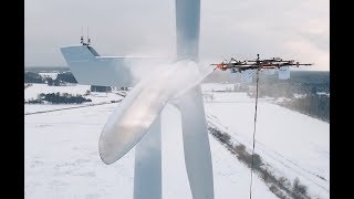 Aerones est un drone imaginé pour nettoyer les éoliennes. Il est relié au sol par un câble lui apportant l’énergie nécessaire à son vol d’entretien. Le deuxième lui apporte l’eau…